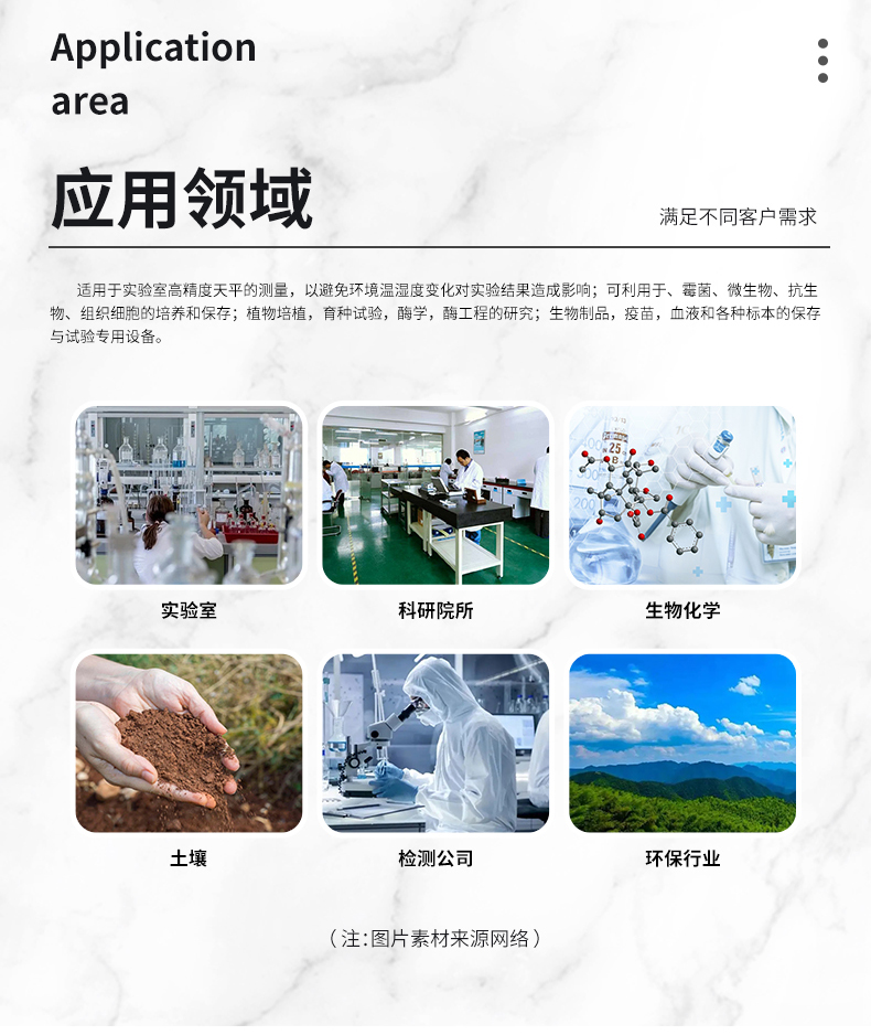 适用于实验室高精度天平的测量,以避免环境温湿度变化对实验结果造成影响;可利用于、霉菌、微生物、抗生物、组织细胞的培养和保存;植物培植,育种试验,酶学,酶工程的研究;生物制品,疫苗,血液和各种标本的保存与试验专用设备。