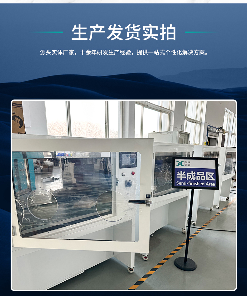 8.称量室采用一体化结构设计,密封性好,箱体上有两个操作入口,并用乳胶长手套进行隔离,方便人工操作实验。