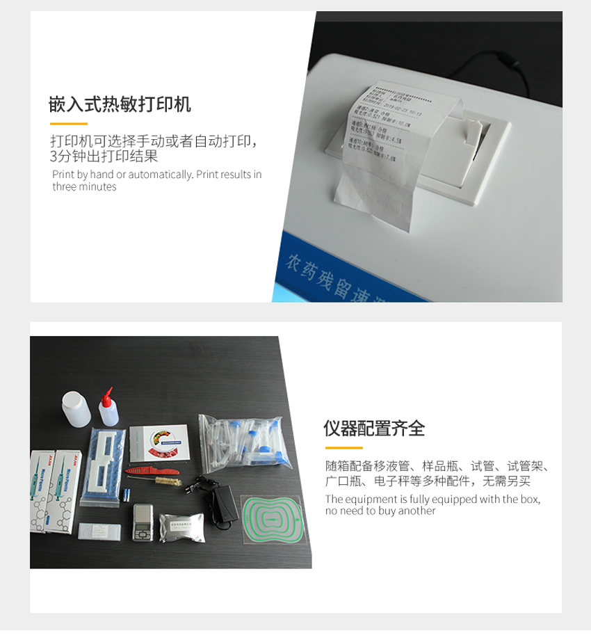 ★5.打印机采用串口5v打印,可选择手动打印或者自动打印,三分钟出打印结果,打印格式为检测人姓名、吸光度差值、检测时间、检测机构、样品名称及结果判定。(显示合格或者不合格)
