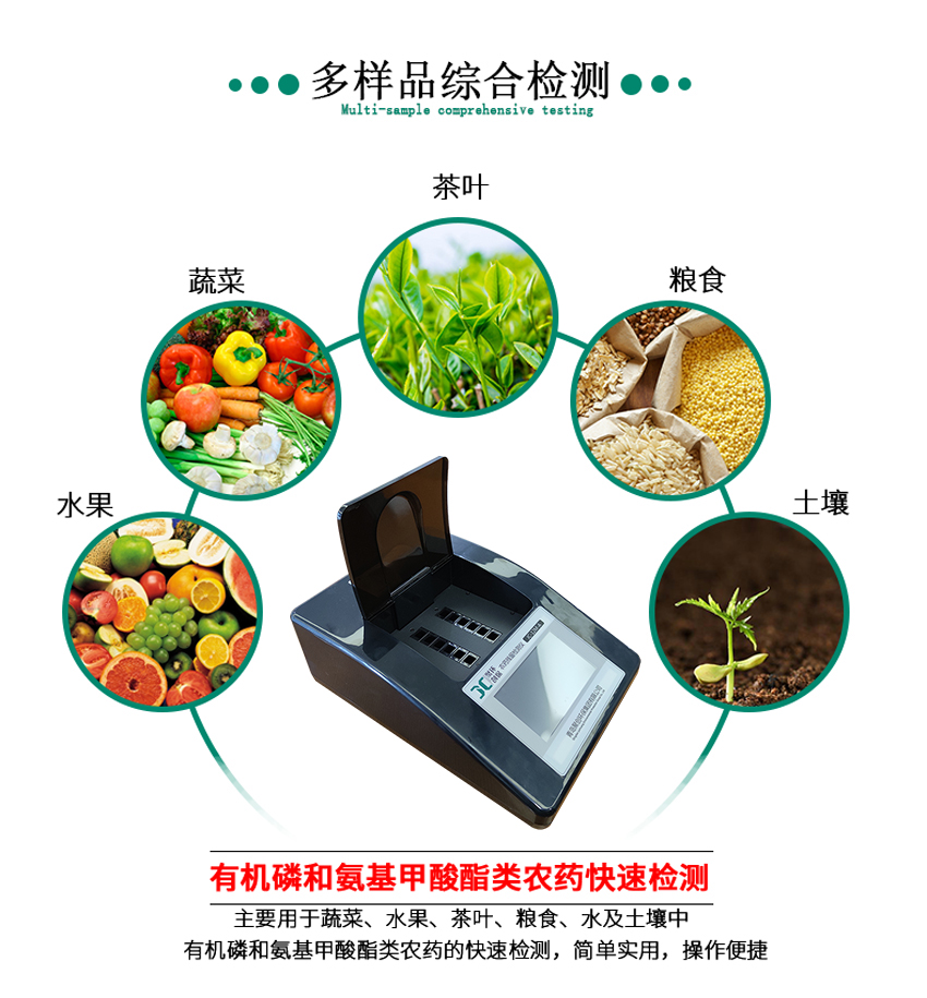 农药残留检测仪是依据国家标准方法GB/T 5009.199-2003《蔬菜中有机磷和氨基甲酸酯类农药残留量的快速检测》而设计的快速检测仪器。主要用于蔬菜、水果、茶叶、粮食、水及土壤中有机磷和氨基甲酸酯类农药的快速检测。仪器简单实用,操作便捷。适用于小型农贸批发销售市场、农产品采购配送中心、酒楼、食堂、家庭果蔬加工前安全检测。