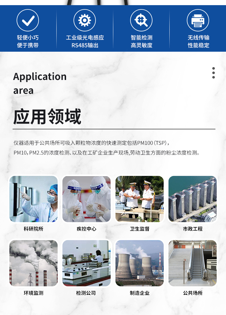 2、分辨率高:≥0.3um颗粒粒径,0.001mg/m³;检测PM2.5、PM10、TSP;
