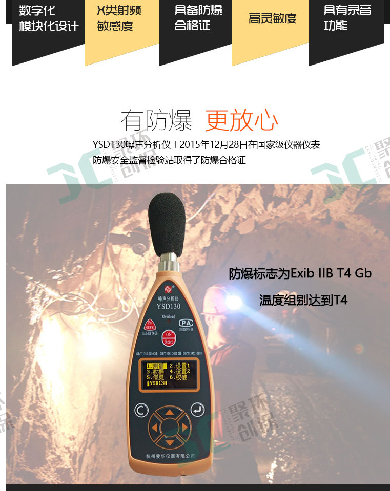 该仪器于2015年12月28日在国家仪器仪表防爆安全监督检验站取得了防爆合格证,防爆标志:ExibIIBT4Gb。由此,本仪器同时具备了型式评价证书、CMC生产许可证和防爆证。该仪器可广泛应用于各种机器、车辆、船舶、电器等工业噪声测量,以及环境噪声、劳动保护、工业卫生的测量。该产品具有较高级别的防爆等级,温度组别达到T4,可在矿井外的爆炸性气体环境中使用,如符合条件的石油、化工、油库、钢铁、焦化等场所。