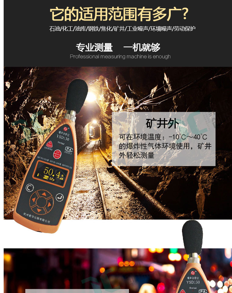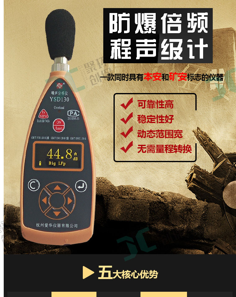 YSD130煤矿用噪声检测仪采用了先进的数字检波技术,具有可靠性高、稳定性好、动态范围宽、无需量程转换等优点。