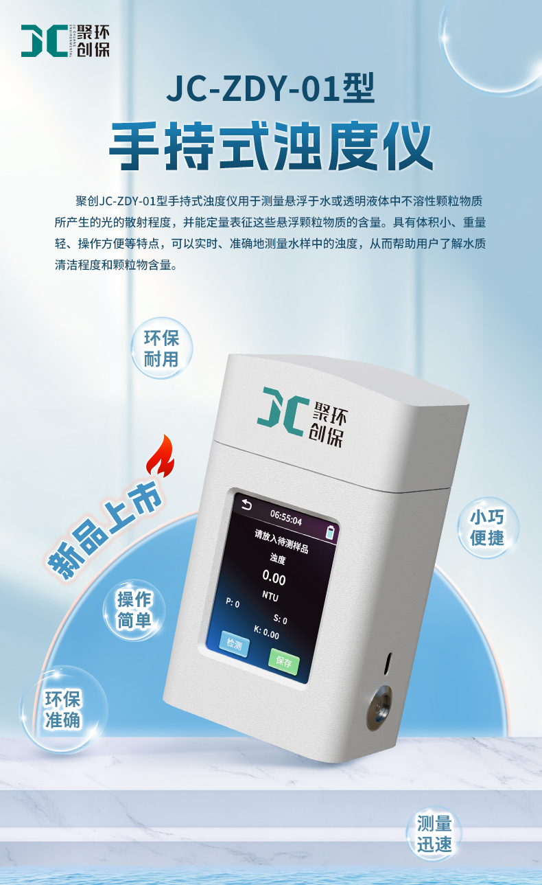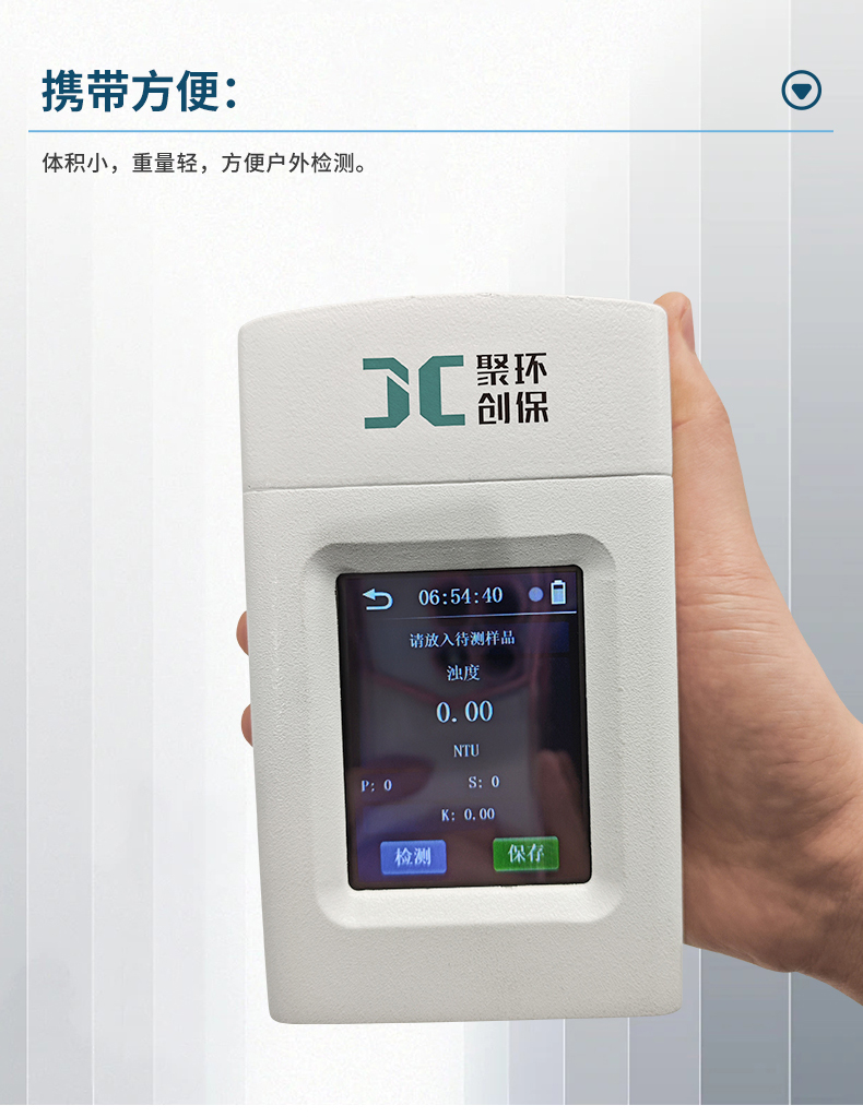 聚创JC-ZDY-01型手持式浊度仪具有体积小、重量轻、操作方便等特点,可以实时、准确地测量水样中的浊度,从而帮助用户了解水质清洁程度和颗粒物含量。该产品通常采用光学透-散射原理进行测量,并配备简洁的操作界面和便携式外观,便于用户随时随地进行浊度测试。