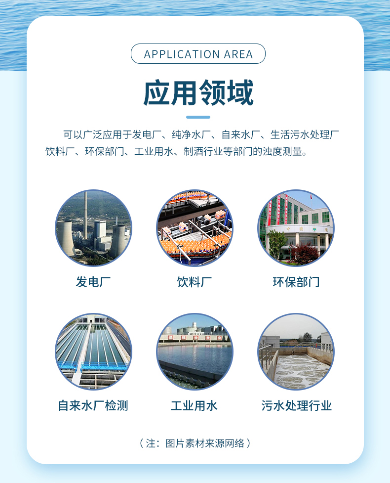 广泛应用于发电厂、纯净水厂、自来水厂、生活污水处理厂、饮料厂、环保部门、工业用水、制酒行业等部门的浊度测量。