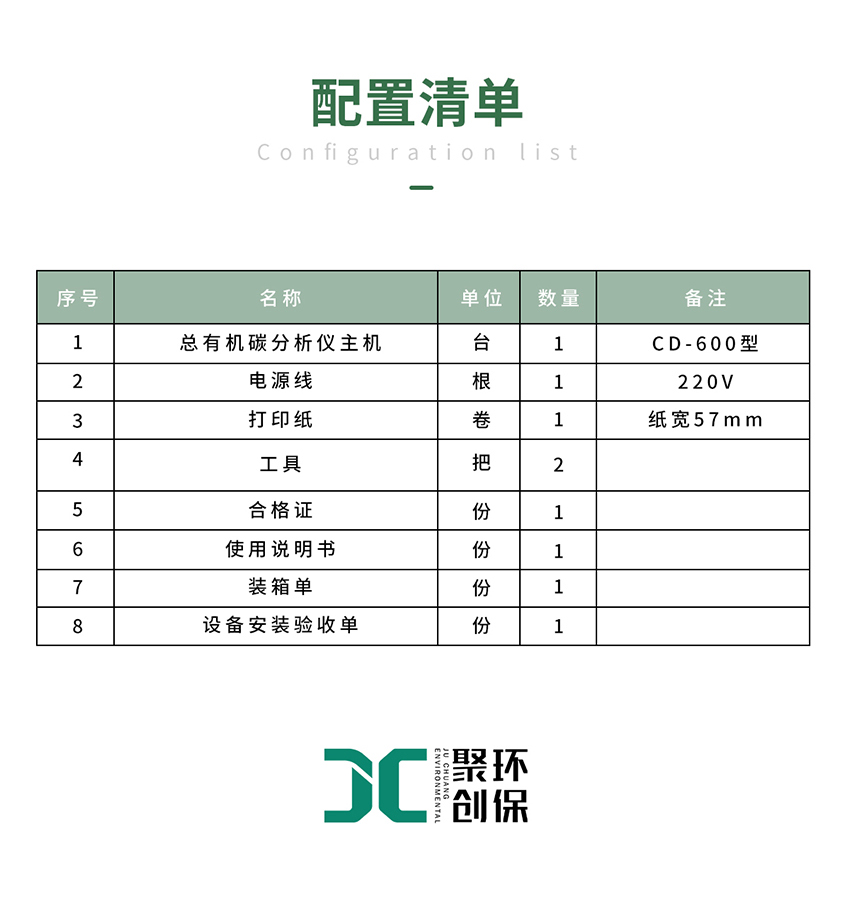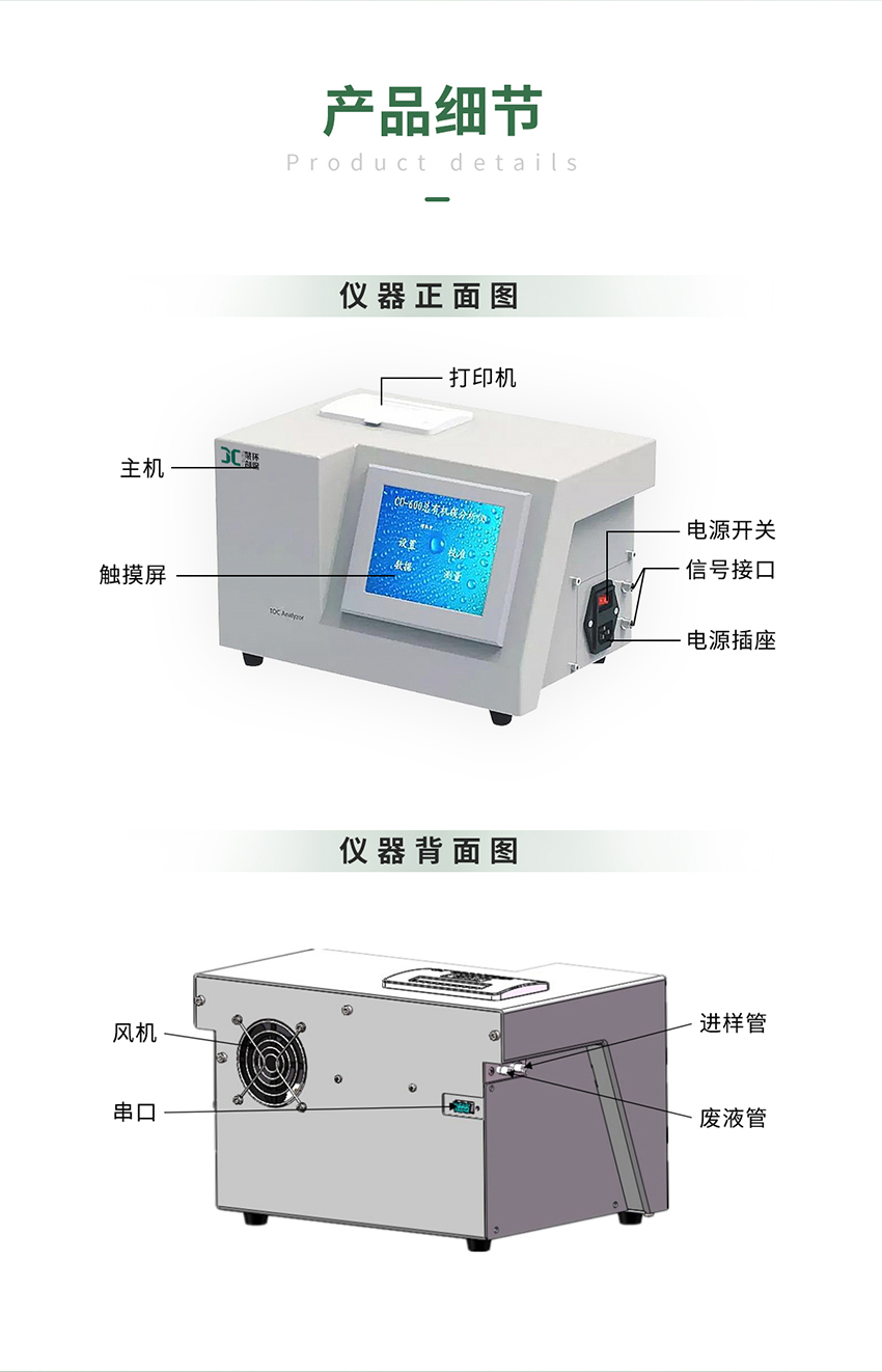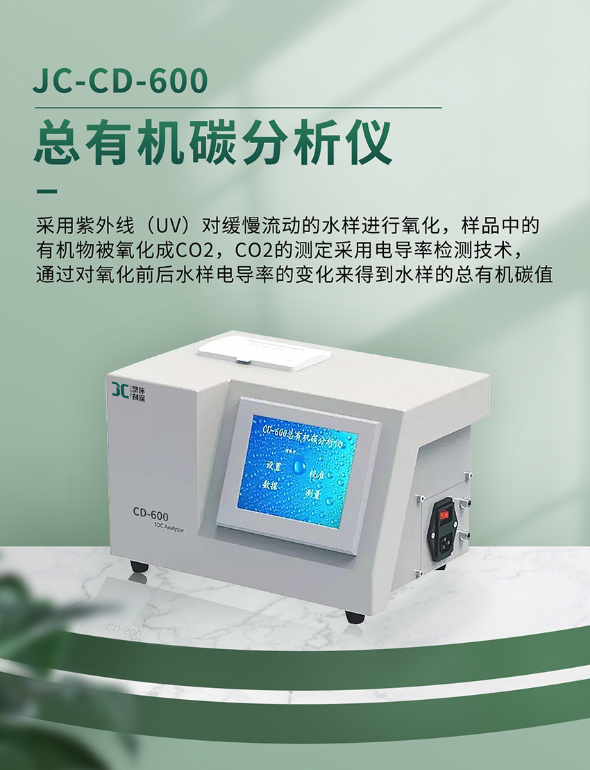 JC-CD-600型总有机碳分析仪是自主研发生产的用于测定水样中总有机碳 浓度的分析仪器,可以检测TOC浓度从0.1µg/L~1500.0µg/L的水样,具有高灵敏度和精确度,以及好的稳定性。 本分析仪广泛的满足客户的要求,软件操作便捷,快速的进行样品分析、分析仪校准和检验。