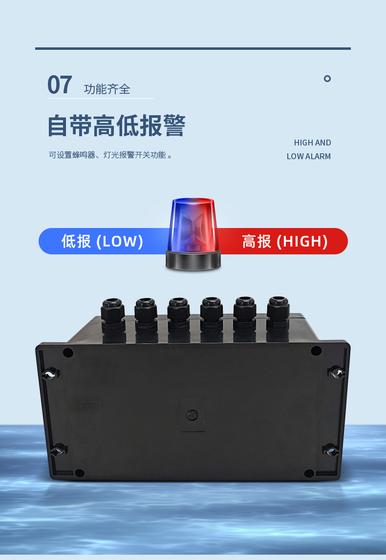 分为高点、低点报警输出,继电器滞后量任意设定,继电器最大负载30VDC/5A
