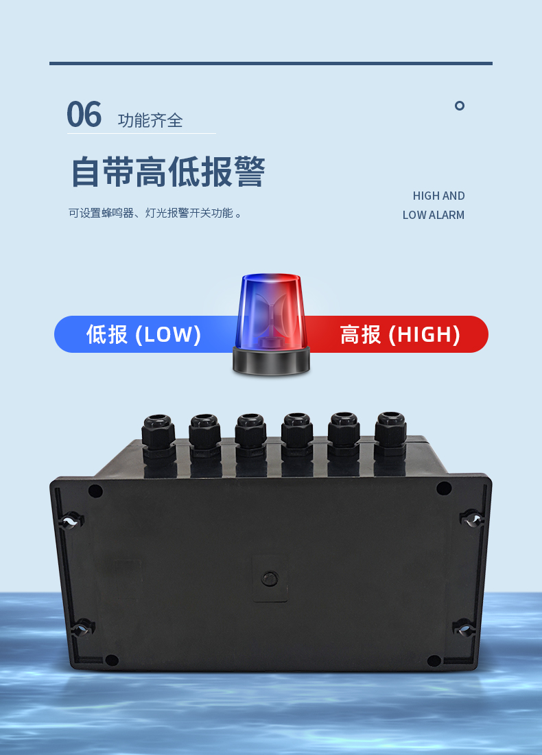 分为高点、低点报警输出,继电器滞后量任意设定,继电器最大负载30VDC/5A