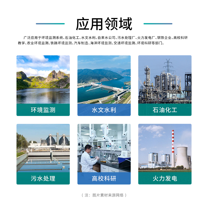 广泛应用于环境监测系统、石油化工、水文水利、自来水公司、污水处理厂、火力发电厂、钢铁企业、高校科研教学、农业环境监测、铁路环境监测、汽车制造、海洋环境监测、交通环境监测、环境科研等部门是环境监测领域,疾病控制领域,职业卫生监测领域的必备仪器。
