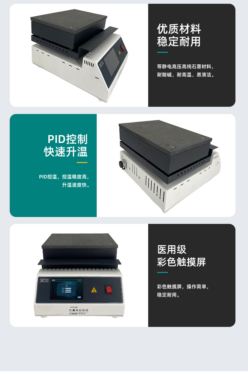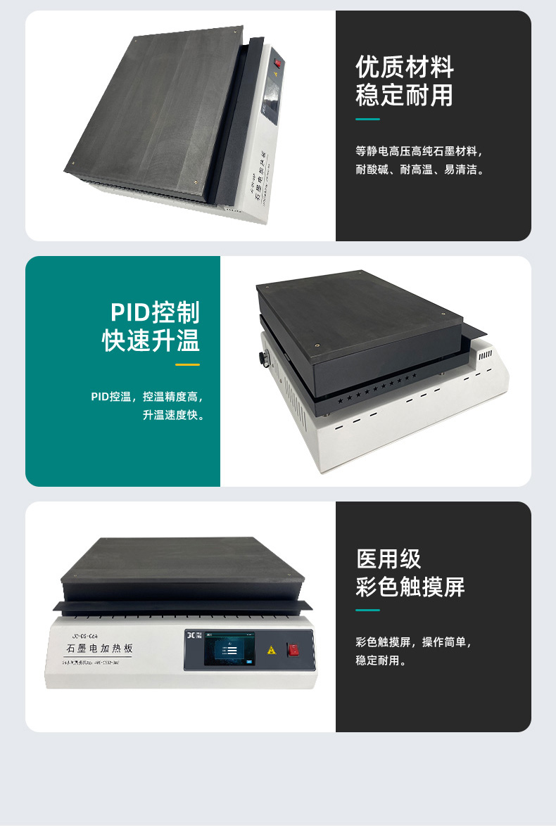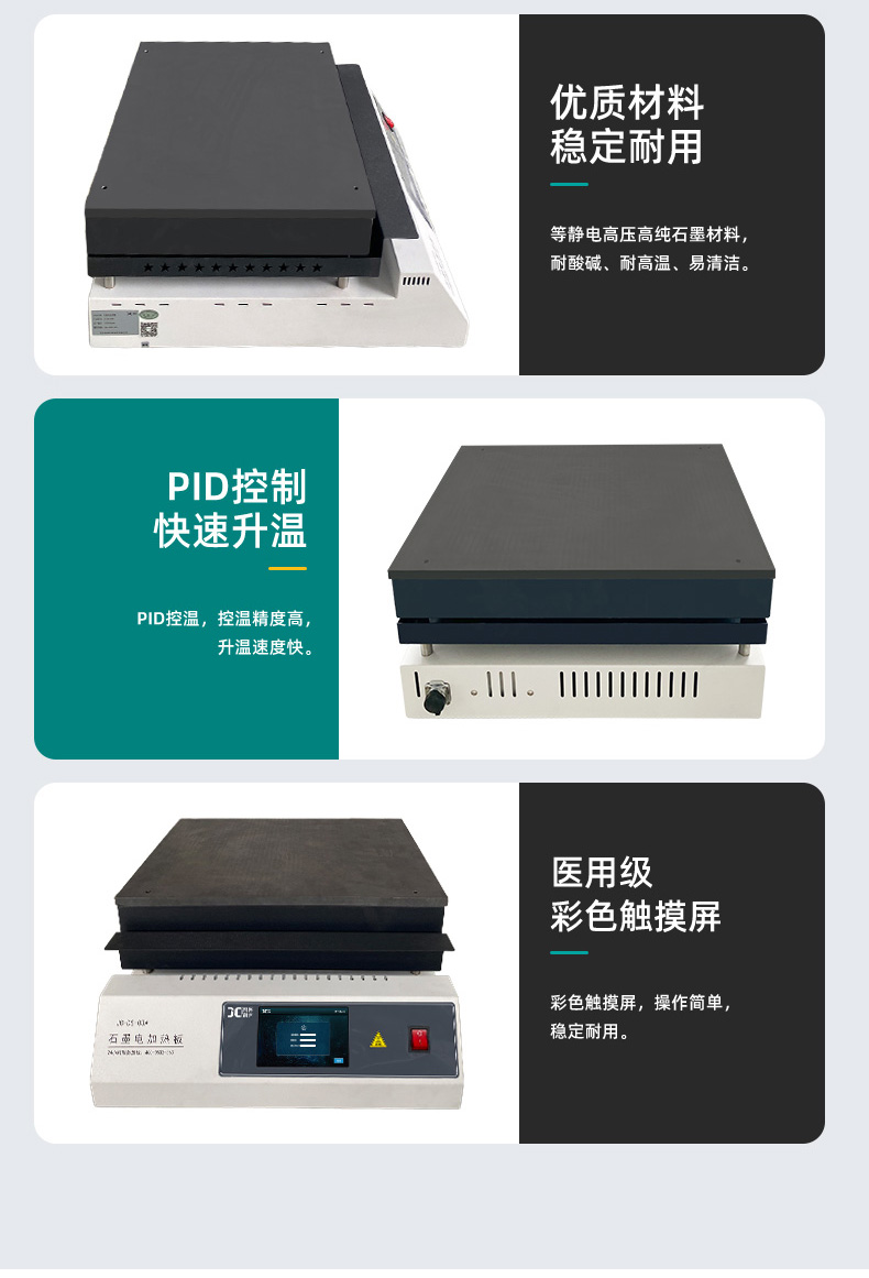 2、加热板选用导热性能优越的等静压高纯石墨,耐酸碱、耐高温、易清洁,加热温度均匀。