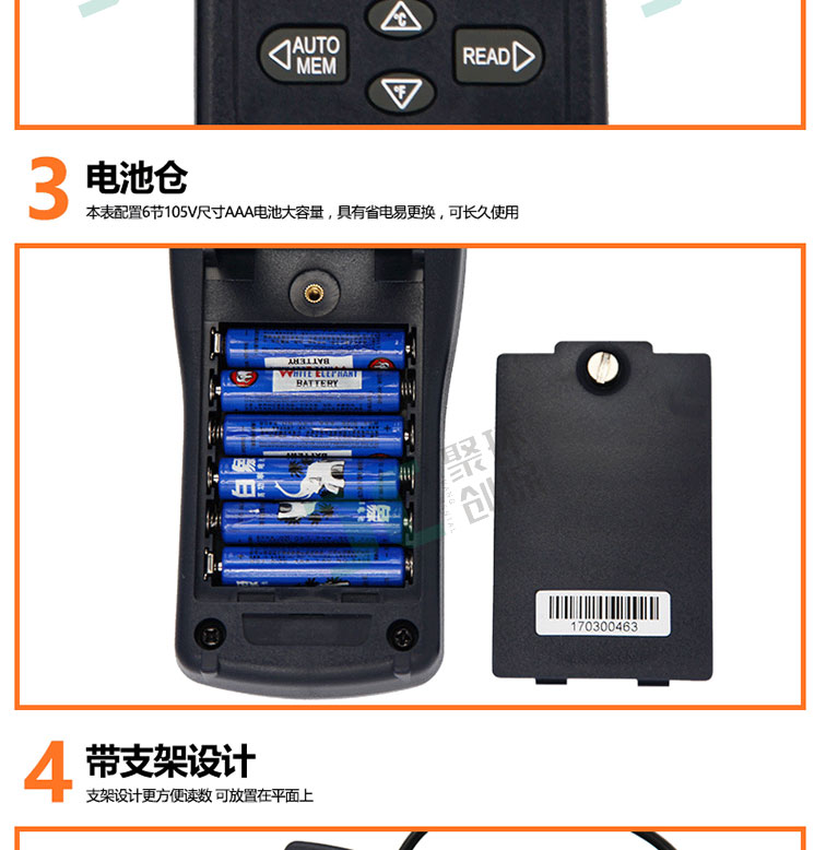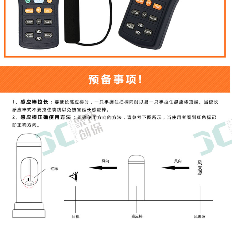 本表使用可伸缩型感应捧,其应用包含风口速度、洁净室、OSHA之依从,通风管及出风口、加热与空调、风洞、产品开发、空气流通研究及风管中之风量测量。