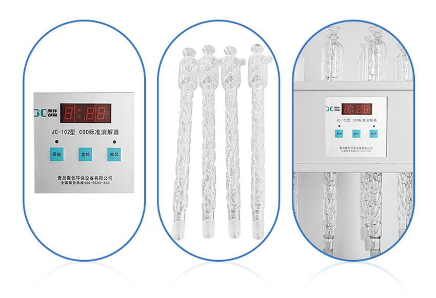 JC-102型标准COD消解器采用微机技术进行定时控制加热电炉,可对8个250ml锥形消解回流装置同时进行加热。达到节能、减低电力负荷、节水、提高 效率的目的。