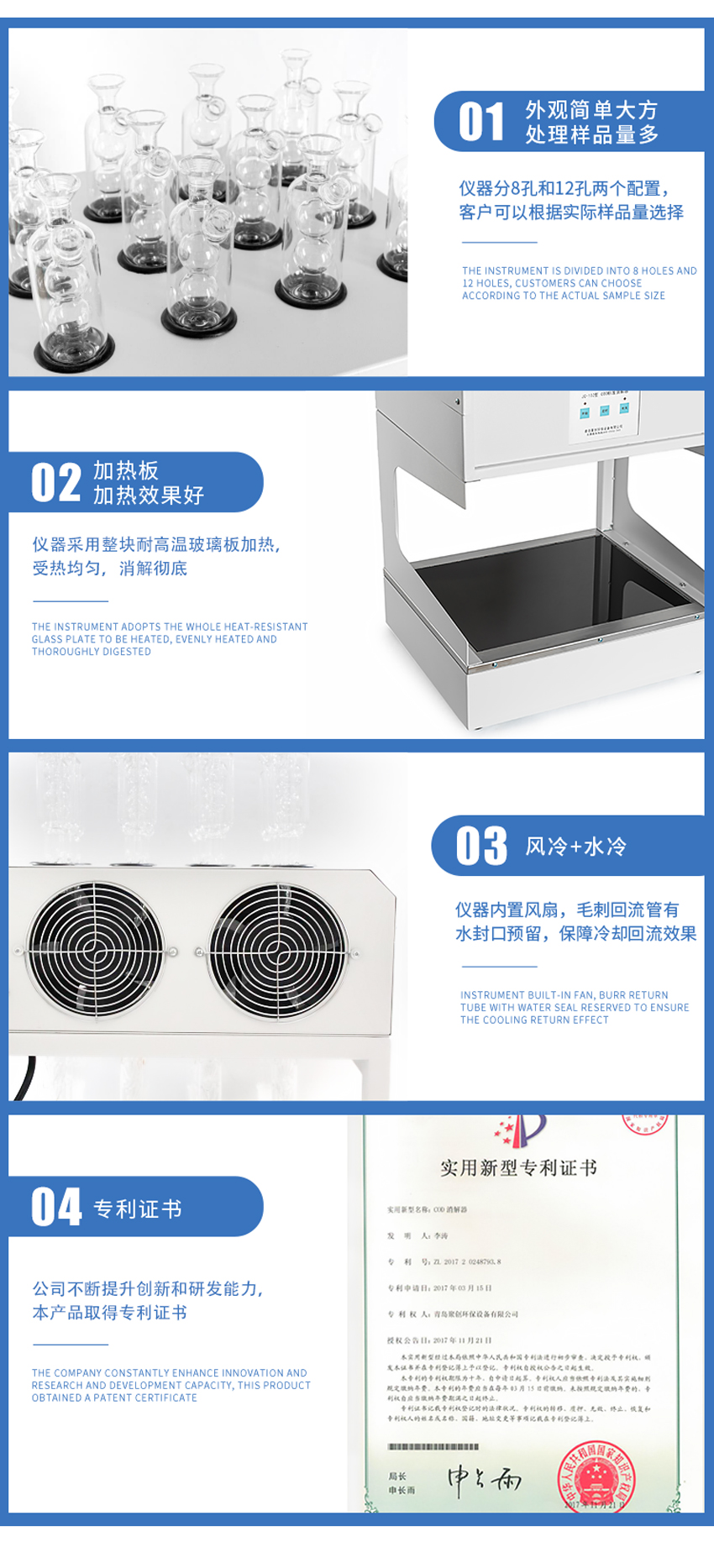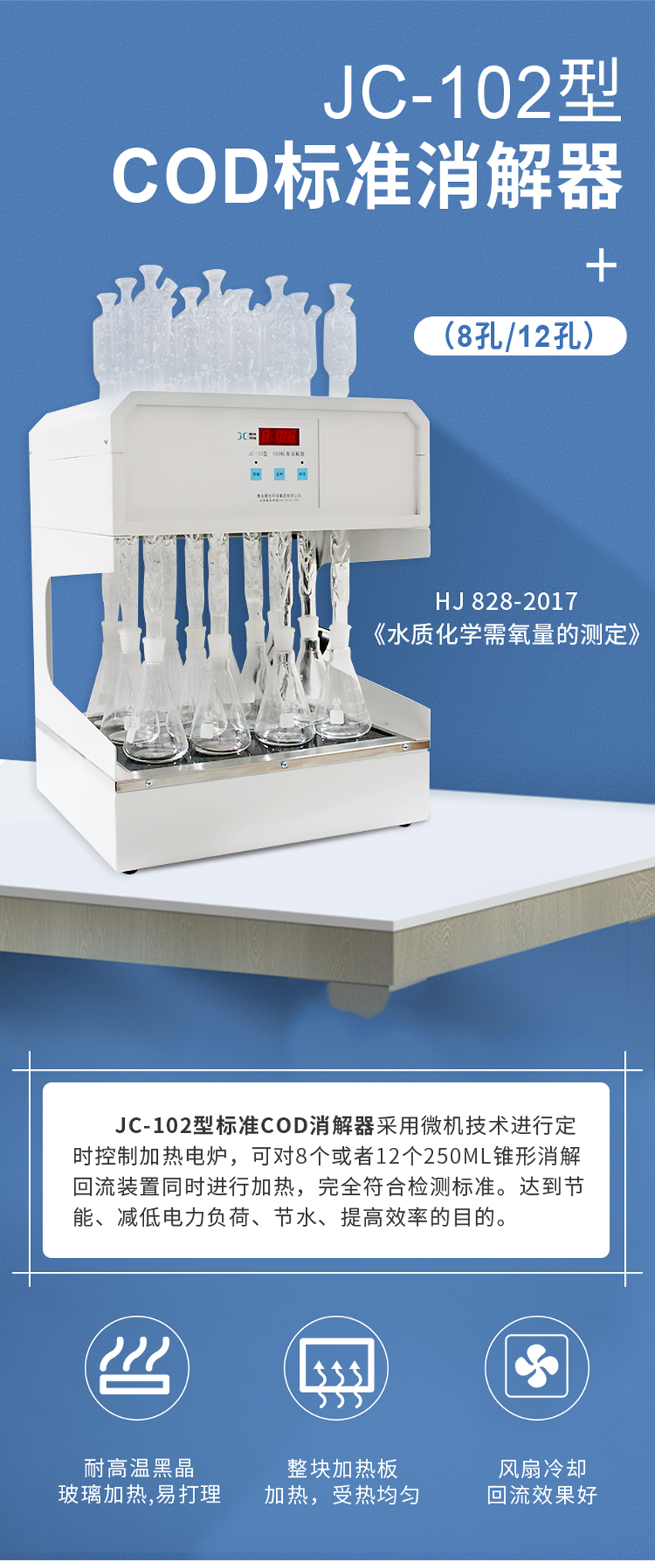 JC-102型标准COD消解器采用微机技术进行定时控制加热电炉,可对8个250ml锥形消解回流装置同时进行加热。达到节能、减低电力负荷、节水、提高 效率的目的。