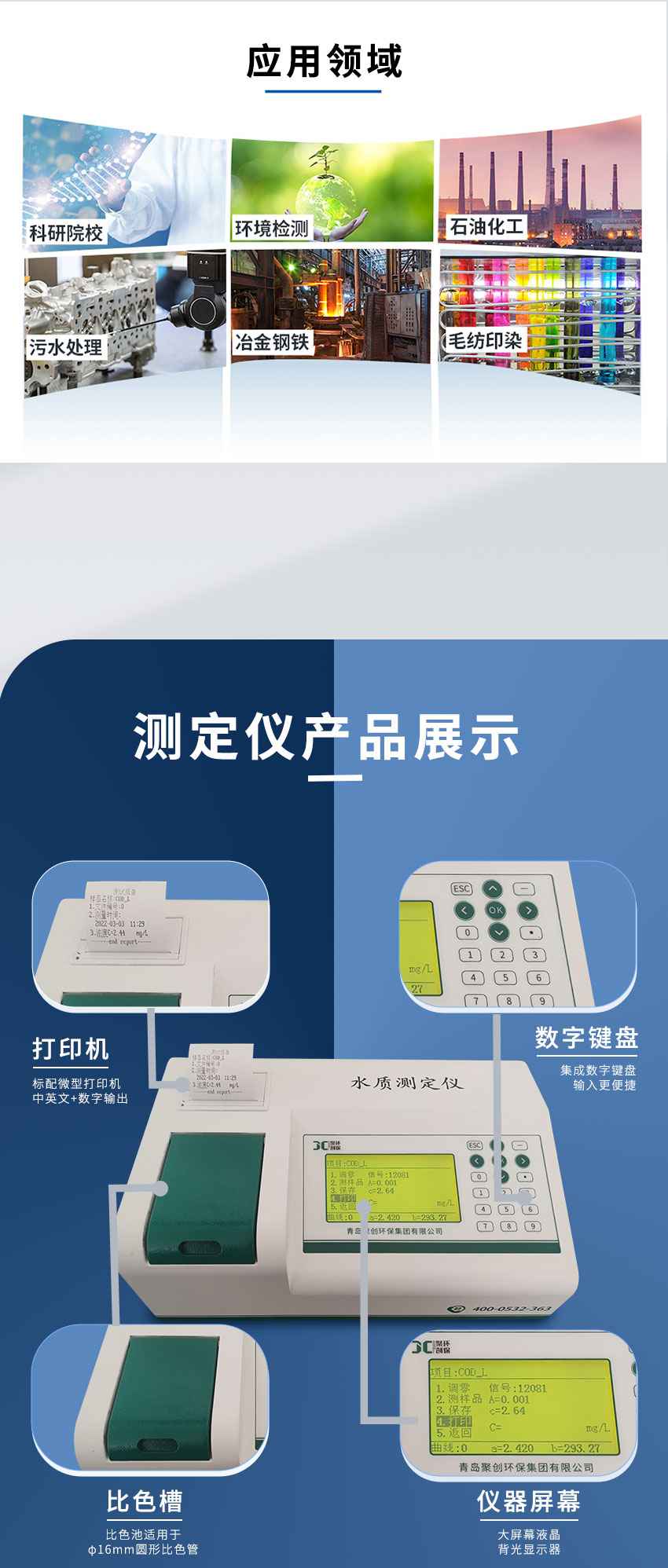 聚创JC-TP-100M型便携式总磷测定仪依据《GB/T 11893 水质 总磷的测定 钼酸铵分光光度法》设计并开发,能准确快速测定水样的总磷指标,适用于检测地表水、地下水等一般环境水样和中轻度污染废水水样。可广泛应用于环保监测站、污水处理厂、大专院校、科研院所、石化、造纸、印染、电子、电力、钢铁、农业、市政工程等行业。