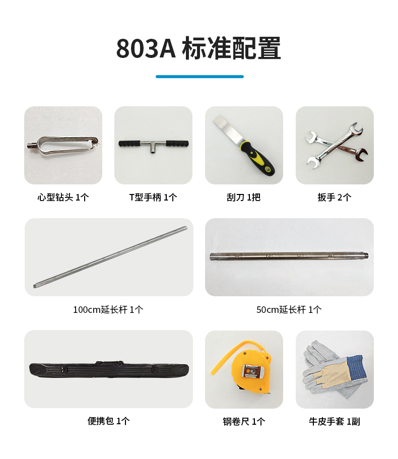 1个心型钻头,1个T型手柄,1个1米延长杆,1个0.5米延长杆,1把刮刀,2个扳手,1个钢卷尺,1个便携包