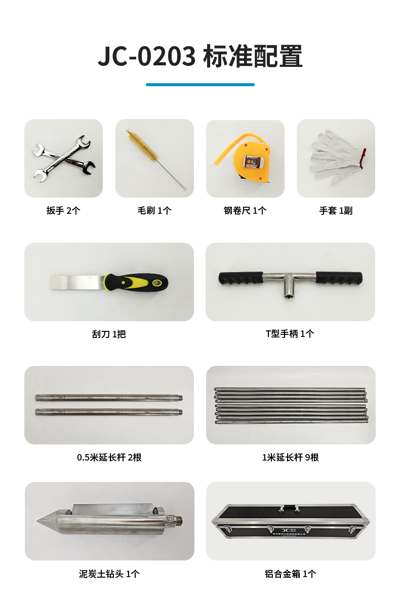 1个T型手柄、2根0.5米延长杆、9根1米延长杆、1个泥炭钻头、1把刮刀、2个扳手、1个钢卷尺、1副手套、1个毛刷、1个铝合金箱
