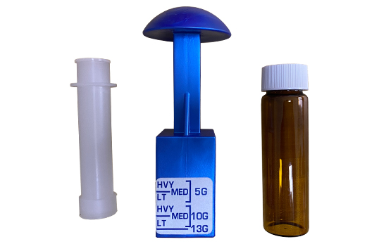安装注射套筒于采样手柄上,采集5g、10g或者13g样品(量程可调)于套筒中,然后直接注射进VOC采样瓶中(40mL棕色瓶),然后盖上瓶盖。手柄,可反复使用。兼具样品储存功能,适合各类土壤类型。满足高效和清洁要求。