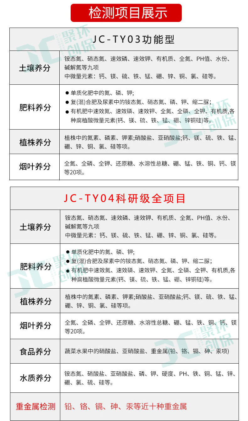 土壤养分:▲铵态氮、硝态氮、磷、钾、有机质、全氮、pH值、水份、碱解氮等九项; ▲ 中微量元素:钙、镁、硫、铁、锰、硼、锌、铜、氯、硅等。
