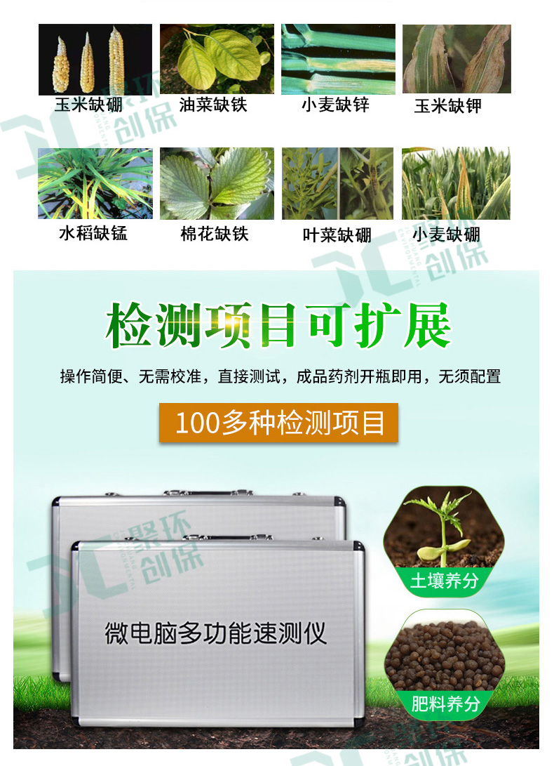 配套齐全:该仪器集药、器、仪为一体,携带方便,相当于一个小型实验室。适于农业服务部门或农资经销商、肥料厂商测土施肥和鉴别肥料真假。