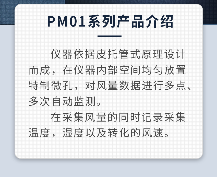 聚创PM01(S)型风量罩(以下简称风量罩)采用皮托管式原理,对风压进行多点、多次自动检测,产生平均风量(m³/h),具有正确、快速、简便的特点,广泛应用于暖通空调、净化技术等行业进行风口和管道风量的直接测定,从而对集中空调的风量实施综合管理及温度、湿度、洁净度等参数的自动控制。